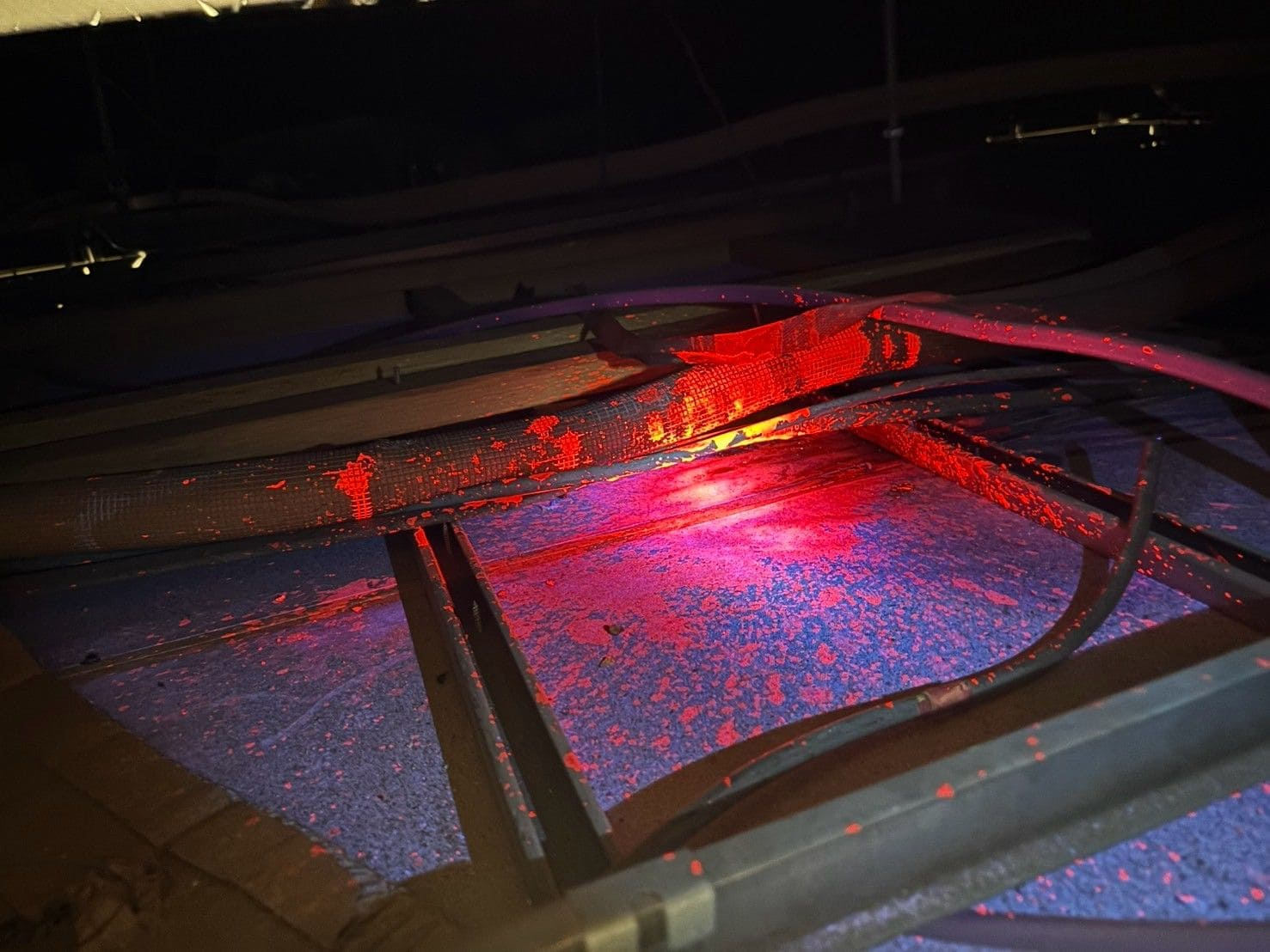 特殊な調査液と紫外線ライト(ブラックライト)を使用し、雨水の動きを再現・可視化する雨漏れ調査方法です。